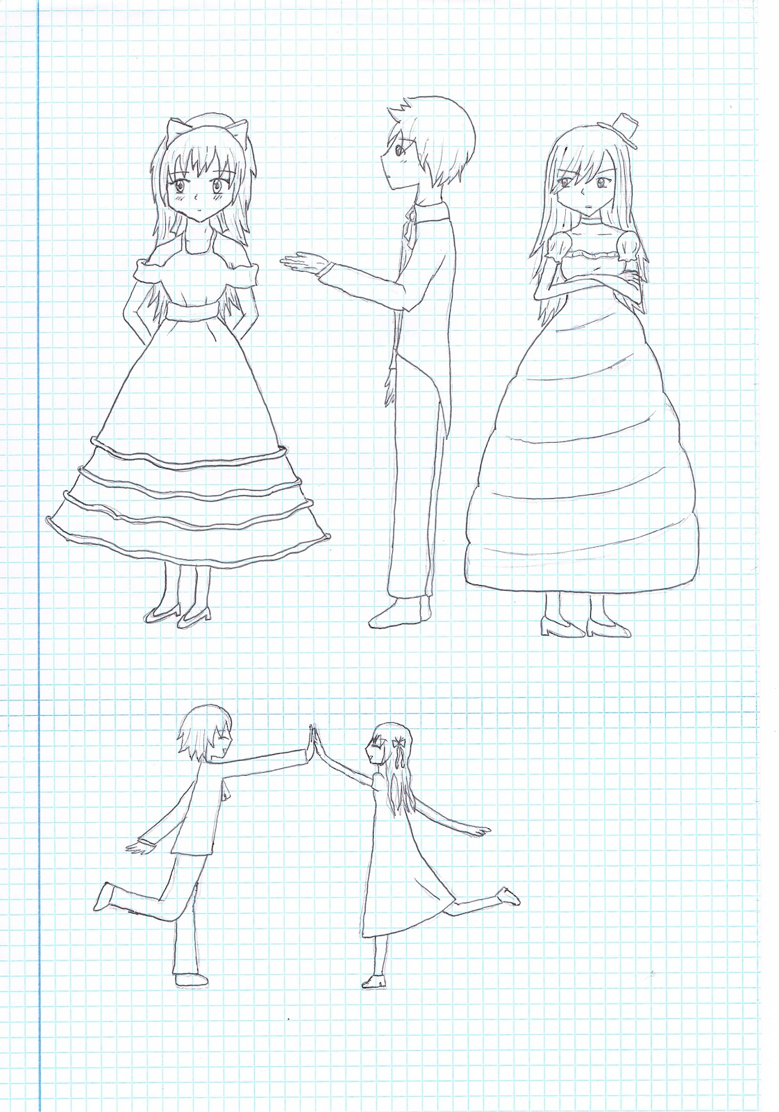 Esto en un principio iba a ser una historia de zombies, se me ocurrió que estaría bien dibujar a los personajes antes de empezar a escribir nada y e aquí lo que pasa por mi imaginación. La primera chica es la prima de la protagonista que está al lado y el chico es un superviviente que encuentran, por el cual se pelean. La niña pequeña es su hermana de 2 o 3 años y admito que me ha quedado muy extraña, casi da hasta miedo!!